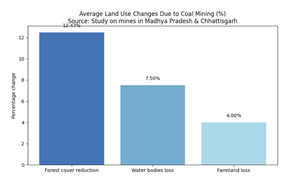 Drawing on the Mongabay study of three mines in Madhya Pradesh and Chhattisgarh, the bar chart below summarises average changes in land use: forest cover declined by about 12 %, water bodies shrank by 7.5 %, and farmland reduced by 4 %.
