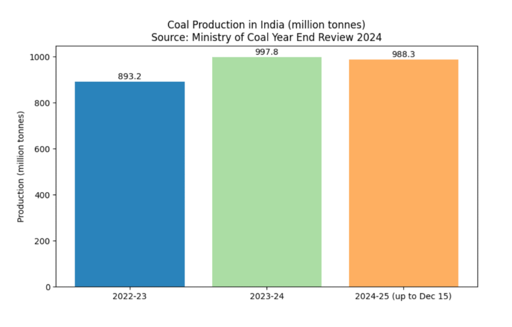 India’s coal production has accelerated in recent years to meet power demand. The bar chart below uses data from the Ministry of Coal’s 2024 Year‑End Review. It shows that production increased from approximately 893 Mt in 2022‑23 (calculated from the 11.71 % growth figure) to 997.826 Mt in 2023‑24 and reached 988.32 Mt by 15 December 2024.