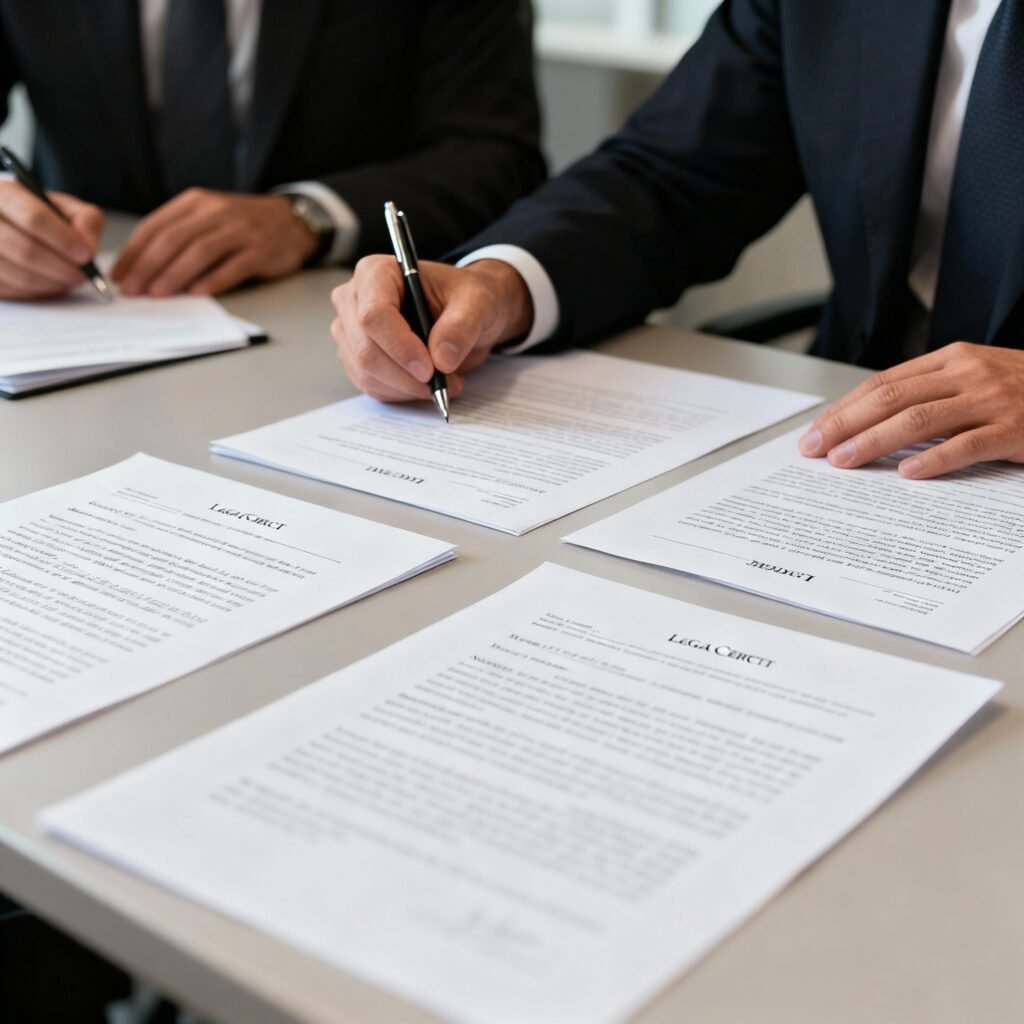 Photo of businesspeople signing contracts. Reality TV contracts often waive contestants’ rights to sue, bar speaking to media, and impose draconian penalties on breach